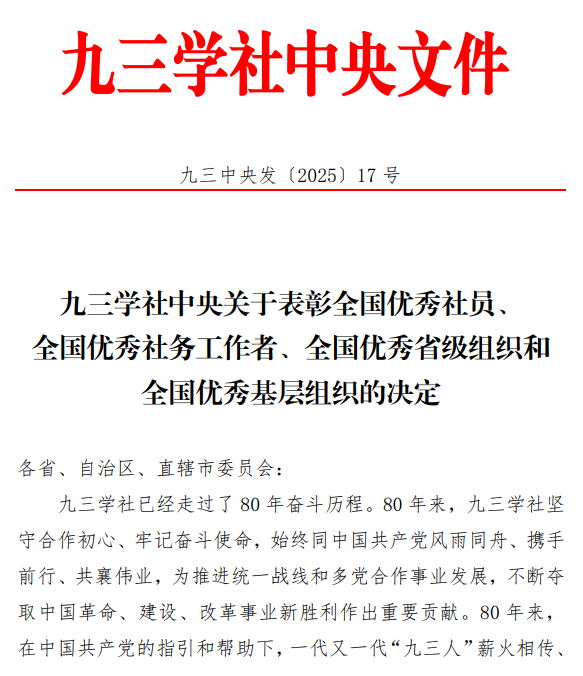 据悉,此次表彰是九三学社中央为传承 “爱国、民主、科学” 优良传统、激励广大社员投身中国特色社会主义事业,依据《九三学社中央表彰奖励工作规定》及《庆祝九三学社创建 80 周年活动筹备方案》,经第十五届中央委员会第三十八次主席办公会议研究决定开展的。表彰不仅是对个人履职成效的肯定,同时彰显了我校九三学社组织在凝心聚力、服务发展中的积极作为。更是我校党委坚强领导下,学校统战部长期统筹推进民主党派建设、服务统战团体发展的生动成果体现。近年来,学校统战部始终坚持“不忘初心、维护核心、服务中心、凝聚人心”的工作定位,围绕民主党派组织建设、统战团体服务、人才队伍培育等全局工作持续发力,为全校统一战线事业高质量发展筑牢根基。
